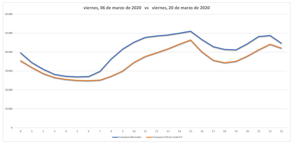 Si nos centramos en las horas de consumo se ha comprobado que la curva se mantiene con respecto a la actividad habitual antes del COVID-19, las horas de mayor consumo durante el confinamiento se concentran en las horas en las que en los hogares se cocina, en torno a las 14h y sobre las 21h.
